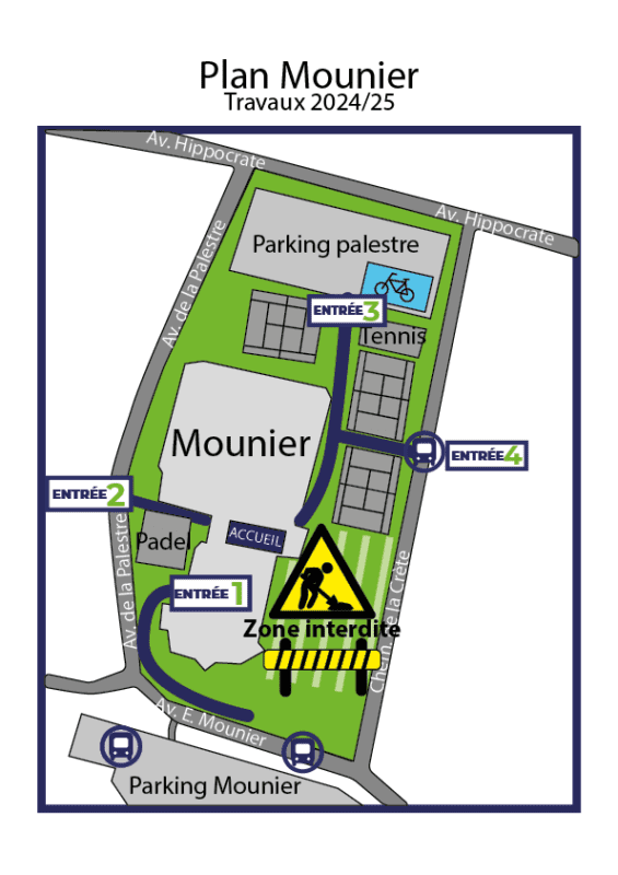 Nous vous rappelons que l’entrée du centre sportif du côté de l’Avenue Emmanuel Mounier est maintenant totalement fermée. Nous avons tout mis en place afin de vous permettre d’avoir accès facilement au centre sportif par 4 autres entrées. Vous pouvez consulter le plan ci-dessous et/ou sur le panneau disposé à l’avant du centre sportif. Une zone a été spécialement aménagée dans le Parking Palestre pour accueillir les cyclistes. Les cyclomoteurs peuvent se garer à l’emplacement qui leur est destiné devant les travaux.
